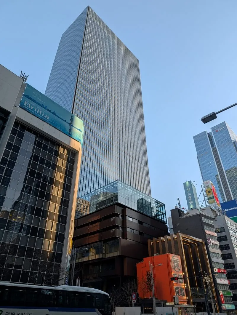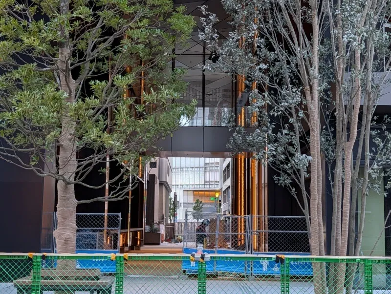 建物南東側の柳通り付近から、「トフロム ヤエス タワー」低層階を見た様子です。