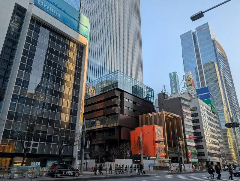 「八重洲仲通り」と「さくら通り」の交差点から、低層階を見た様子です。