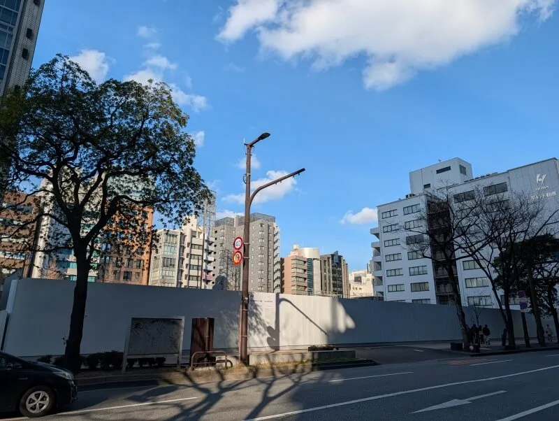 明治通り沿いの「天神住友生命FJビジネスセンター」北側から、着工した再開発の敷地を見た様子です。