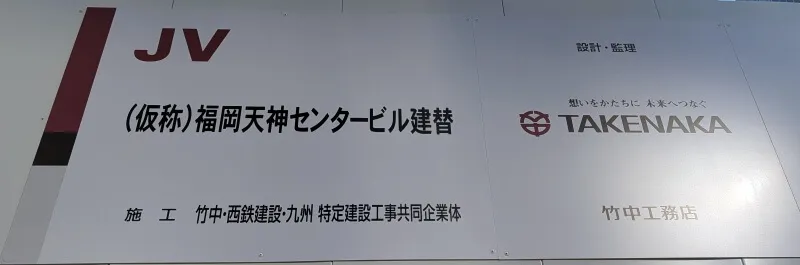 現地の工事用の白いパネルに掲示されていた、「(仮称)福岡天神センタービル建替」の看板です。