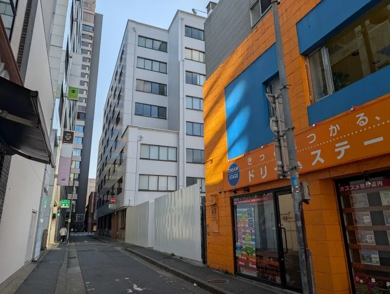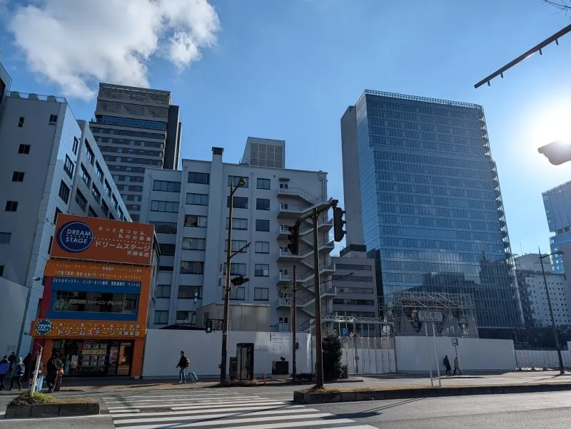 天神3丁目交差点から明治通りに向かう道から、再開発の敷地を見た様子です。「ドリームステージ天神本店」と「福岡証券ビル」の間に、「(仮称)福岡天神センタービル建替計画」の建物に繋がる通路が出来る予定です。
