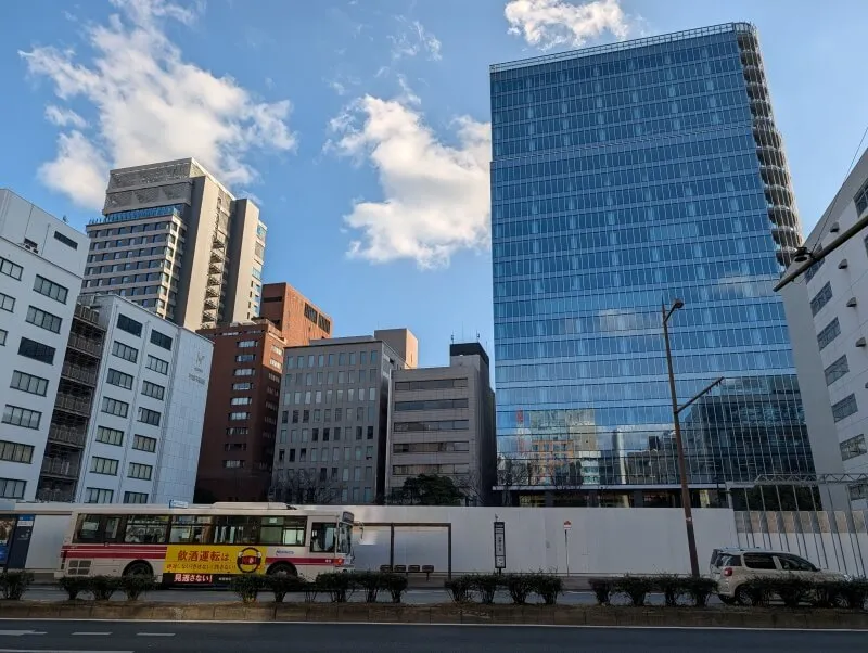 昭和通り沿いを西側に移動して、再開発の敷地を見た様子です。奥に見える西側の建物が、「天神住友生命FJビジネスセンター」です。東側の高い建物は、19階約92m「ヒューリックスクエア福岡天神」となります。「ヒューリックスクエア福岡天神」も、天神ビッグバンの一環として再開発された、複合施設の建物となります。