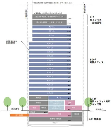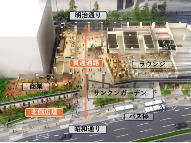 野村不動産の資料から、建物1階のイメージ図です。昭和通りと明治通りの間に、貫通通路が出来る予定です。歩行者の回遊性が上がるのが良いなと思いました。