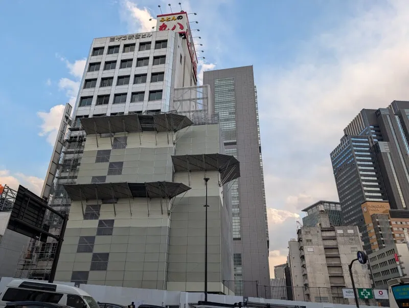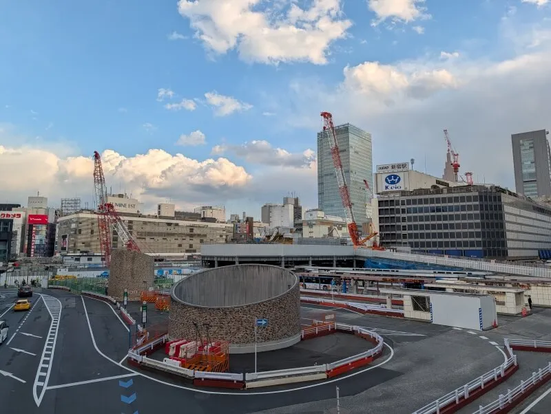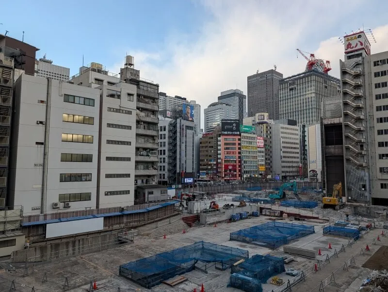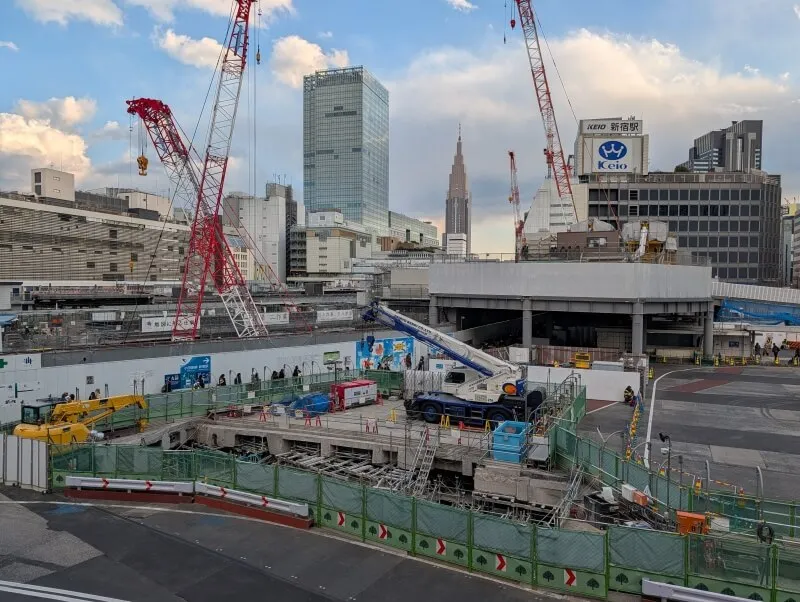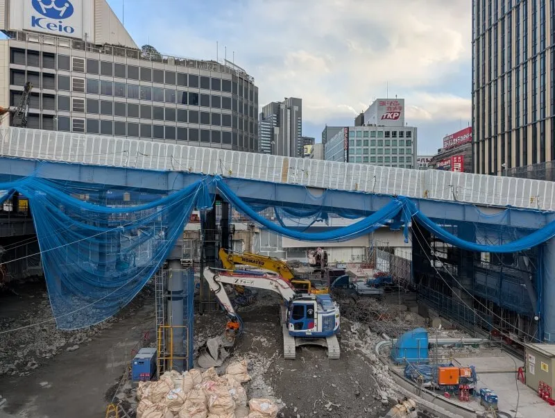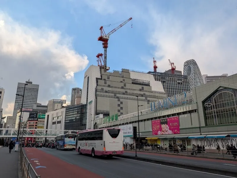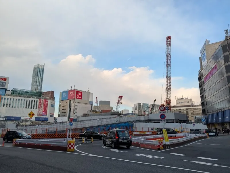 新宿駅新南口改札から甲州街道沿いに出て、解体工事中の「新宿ミロード」跡地を見た様子です。