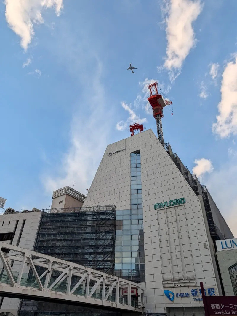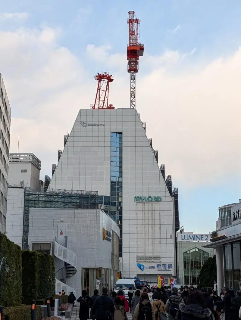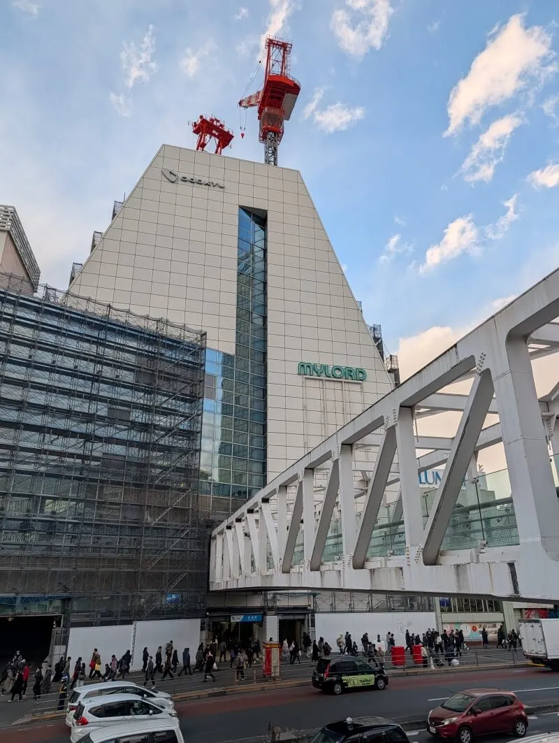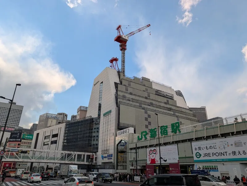 新宿駅南口の横断歩道付近から、解体工事中の「新宿ミロード」を見た様子です。