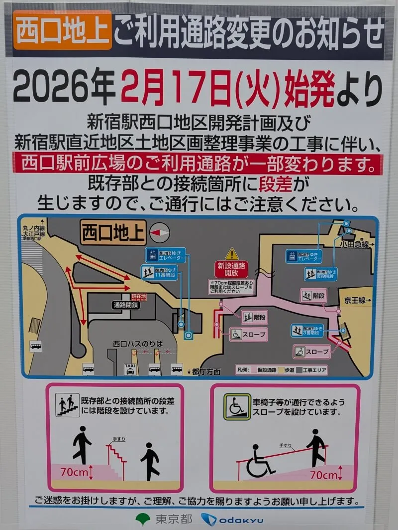 2026年2月17日から、JR新宿西口の地上の通路の一部が変更され、既存の通路と段差が出来るという、案内が掲示されていました。段差は約70cmの高さとなるそうです。また、階段だけでなく、スロープも設置される予定です。