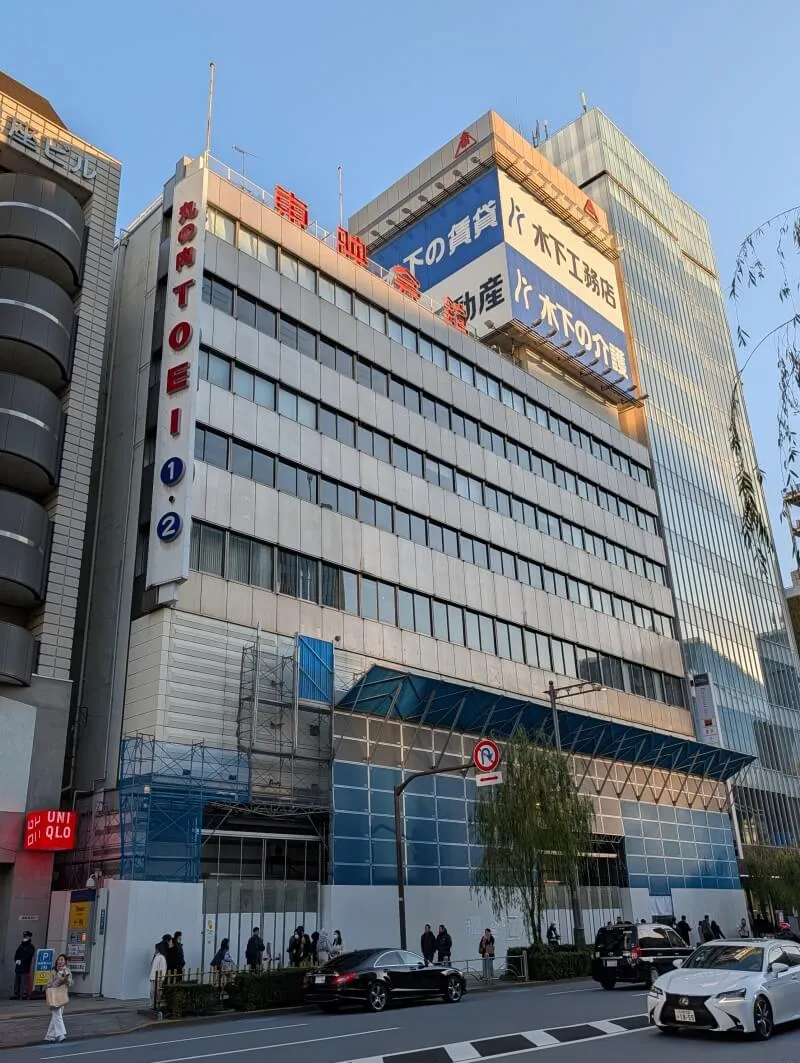 建物の北東側の銀座柳通り沿いから、建物低層階を見た様子です。