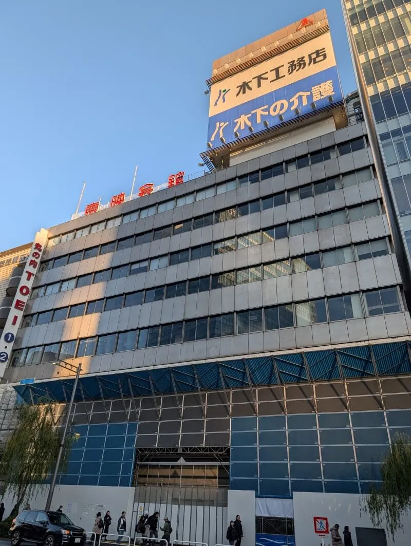 2025年7月27日に閉館した「丸の内TOEI」があった、「東映会館解体工事」の様子です。外堀通り沿いの南西側から、解体工事中の建物を見た様子です。建物の4割くらいの高さまで、解体工事用の足場が組まれていました。
