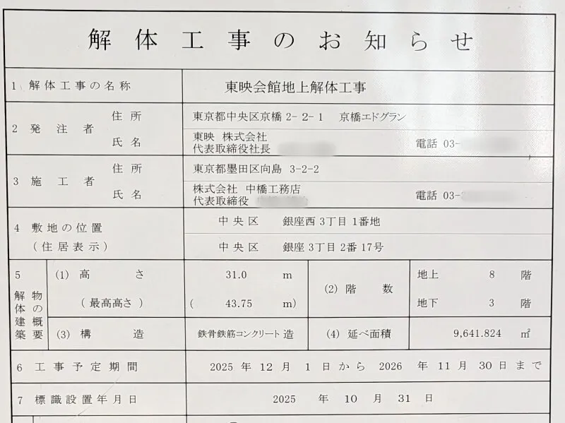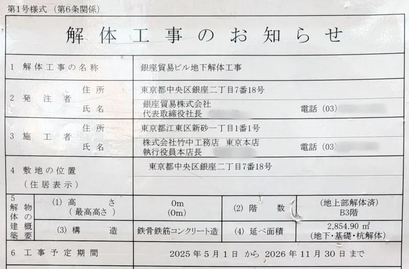 中央通りの銀座一丁目交差点付近から見た、「銀座貿易ビル解体工事」の様子です。