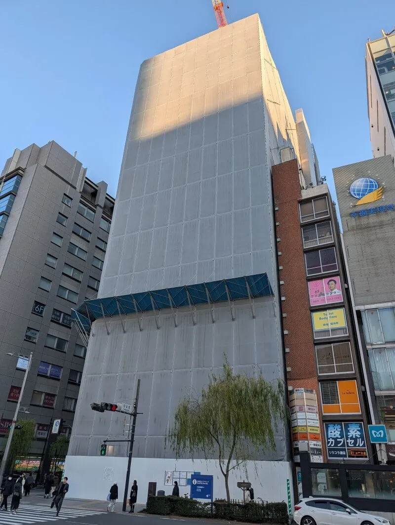 有楽橋交差点の西側から、施工中の建物の低層階を見た様子です。