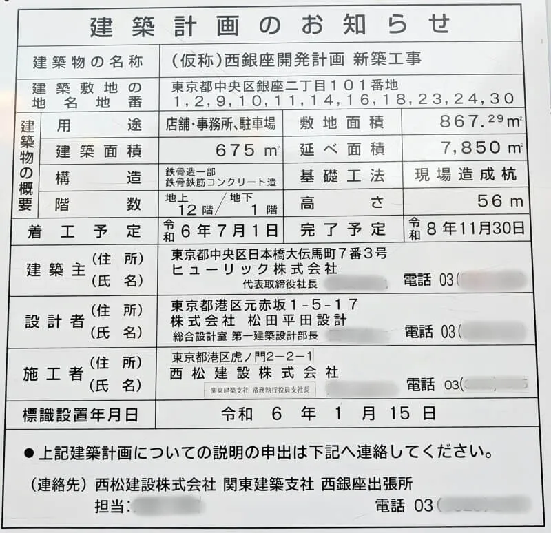 (仮称) 西銀座開発計画 ヒューリック株式会社