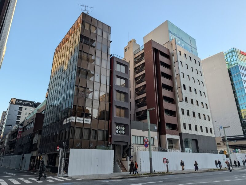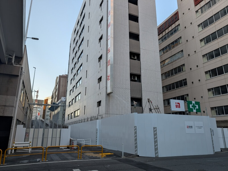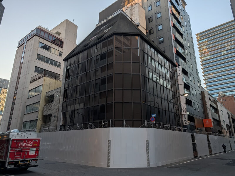 再開発の敷地の南東側から、再開発の敷地を見た様子です。「主婦と生活社ビル」の周辺にも、解体工事用のフラットパネルが設置されていました。