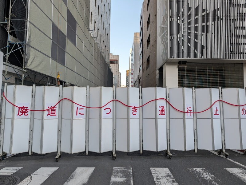「東京建物京橋ビル」と「ポリスミュージアム(警察博物館)」の間の京橋竹河岸通りは、廃道となり通行出来なくなっていました。