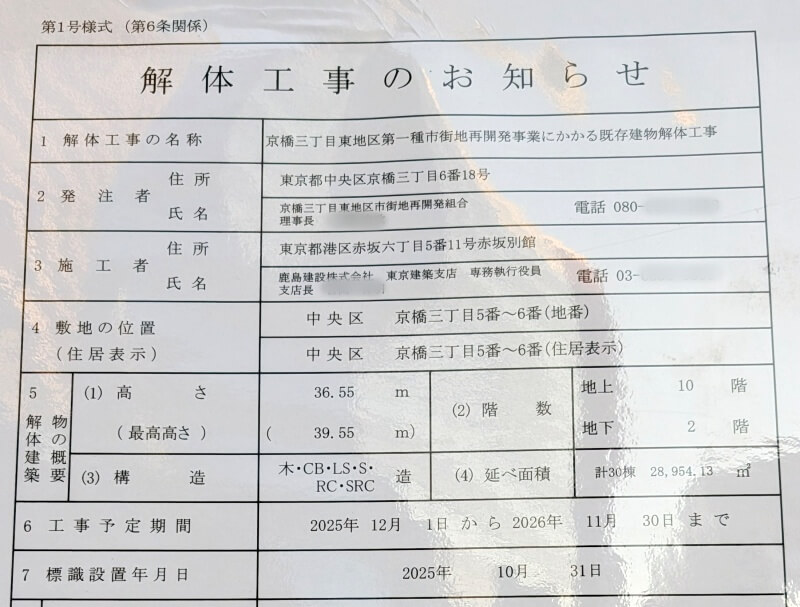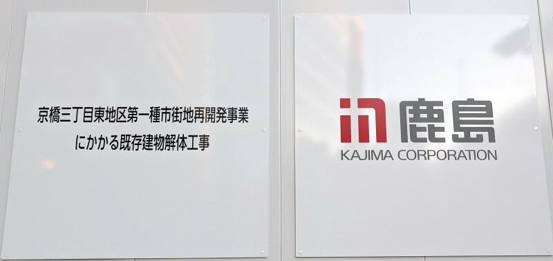 京橋三丁目東地区第一種市街地再開発事業にかかる既存建物解体工事のお知らせが、現地の工事用パネルに掲示されていました。解体工事は、鹿島建設が担当されています。