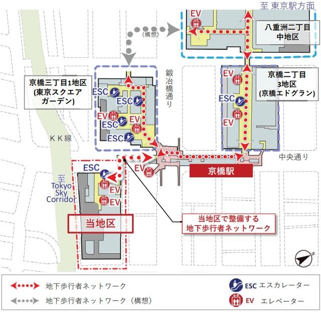 以下、地下の歩行者ネットワーク図です。建物の地下で京橋駅と接続し、将来的には東京駅まで地下で接続する事となります。