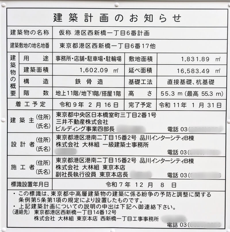 以下、現地に掲示されていた、建築計画のお知らせです。こちらは11階55mの建物が建つ予定です。