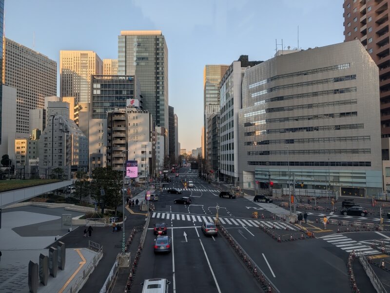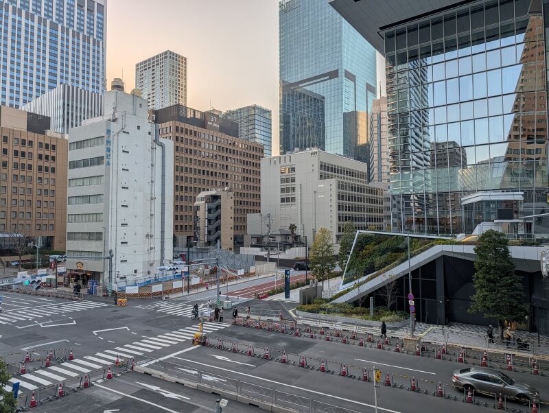 「虎ノ門ヒルズ 森タワー」と「虎ノ門ヒルズステーションタワー」の間の歩行者デッキの上から、桜田通り北側の虎の門二丁目交差点を見た様子です。交差点周辺でも、道路の整備工事が続いていました。