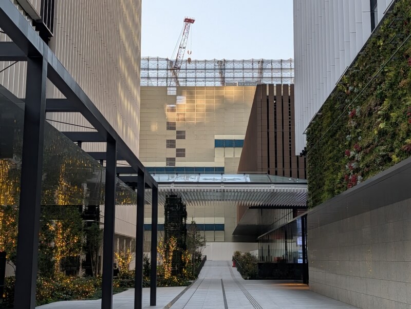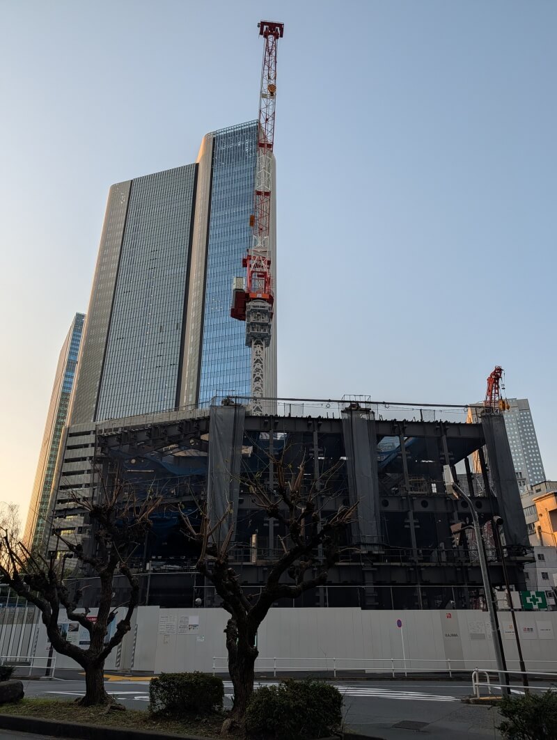 東側から施行中の建物を見た様子です。タワークレーンが出現しており、地上部の鉄骨が見えていました。