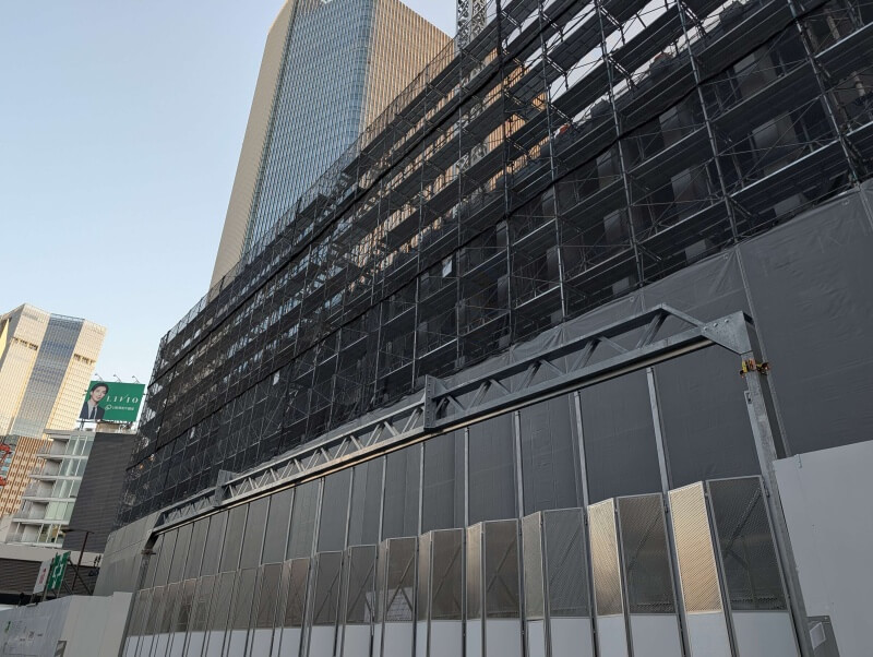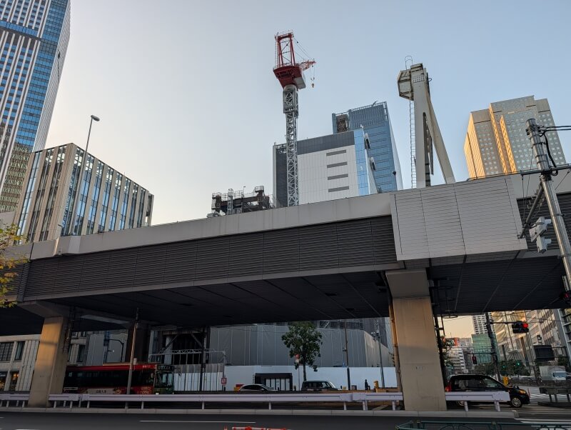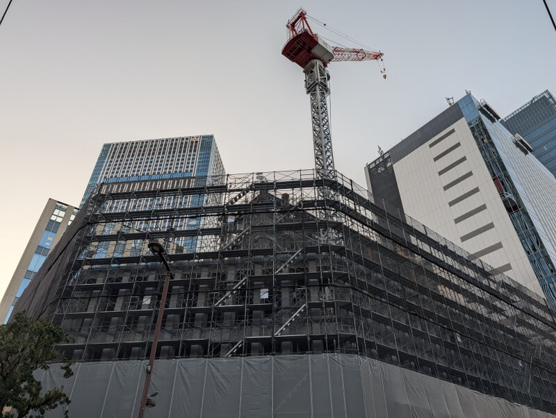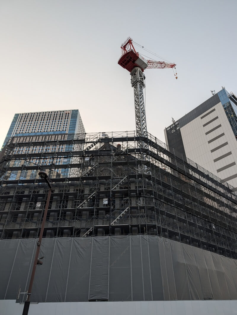 建物のそばからだと見辛いので、外堀通りを北側に移動し、施工中の建物を見た様子です。
