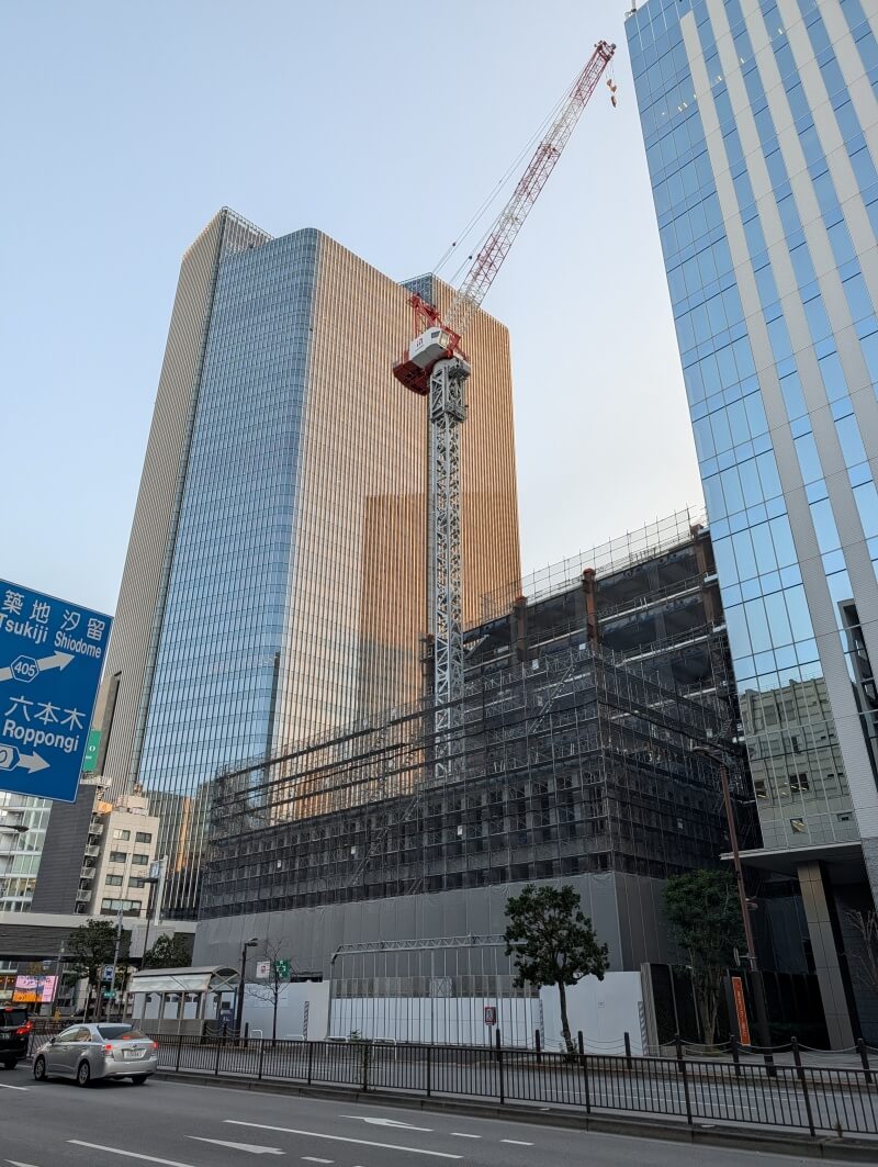 溜池交差点を渡り、建物傍からタワークレーンを見上げた様子です。