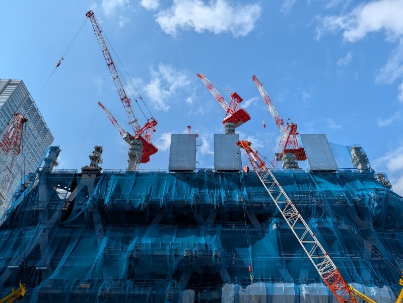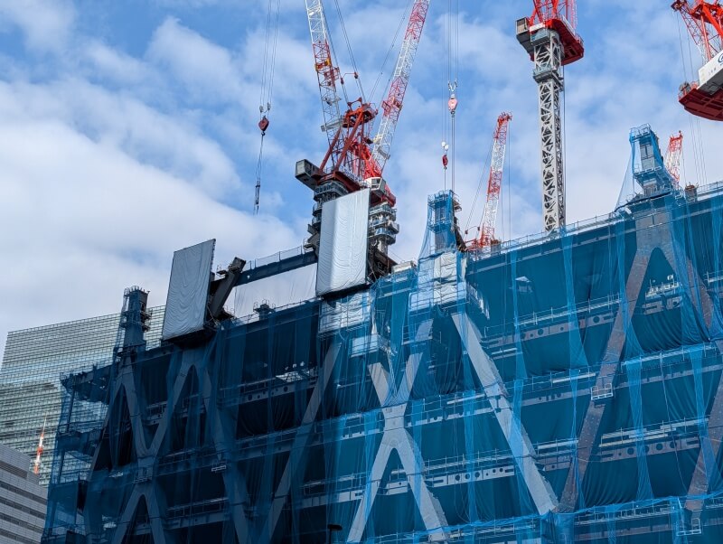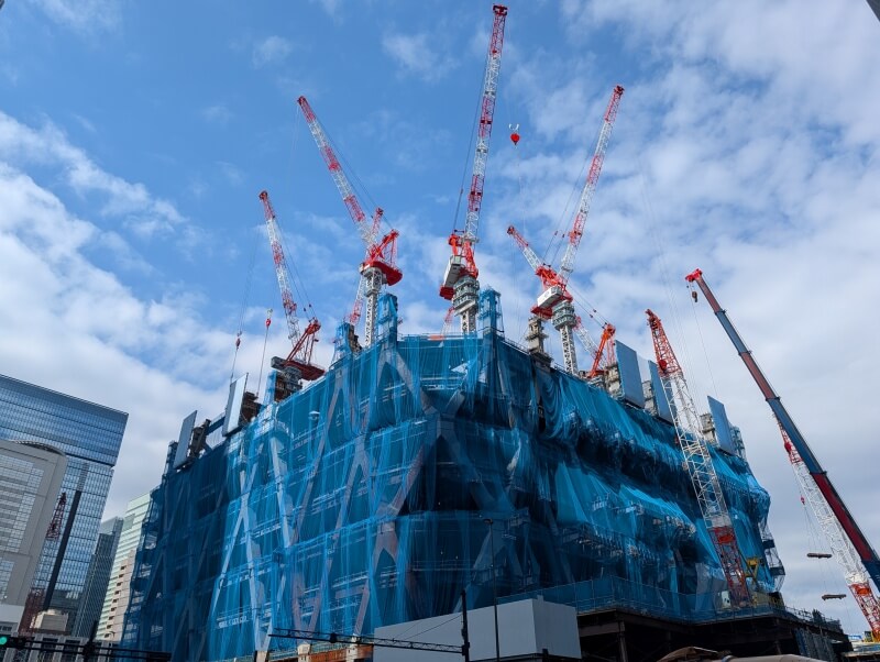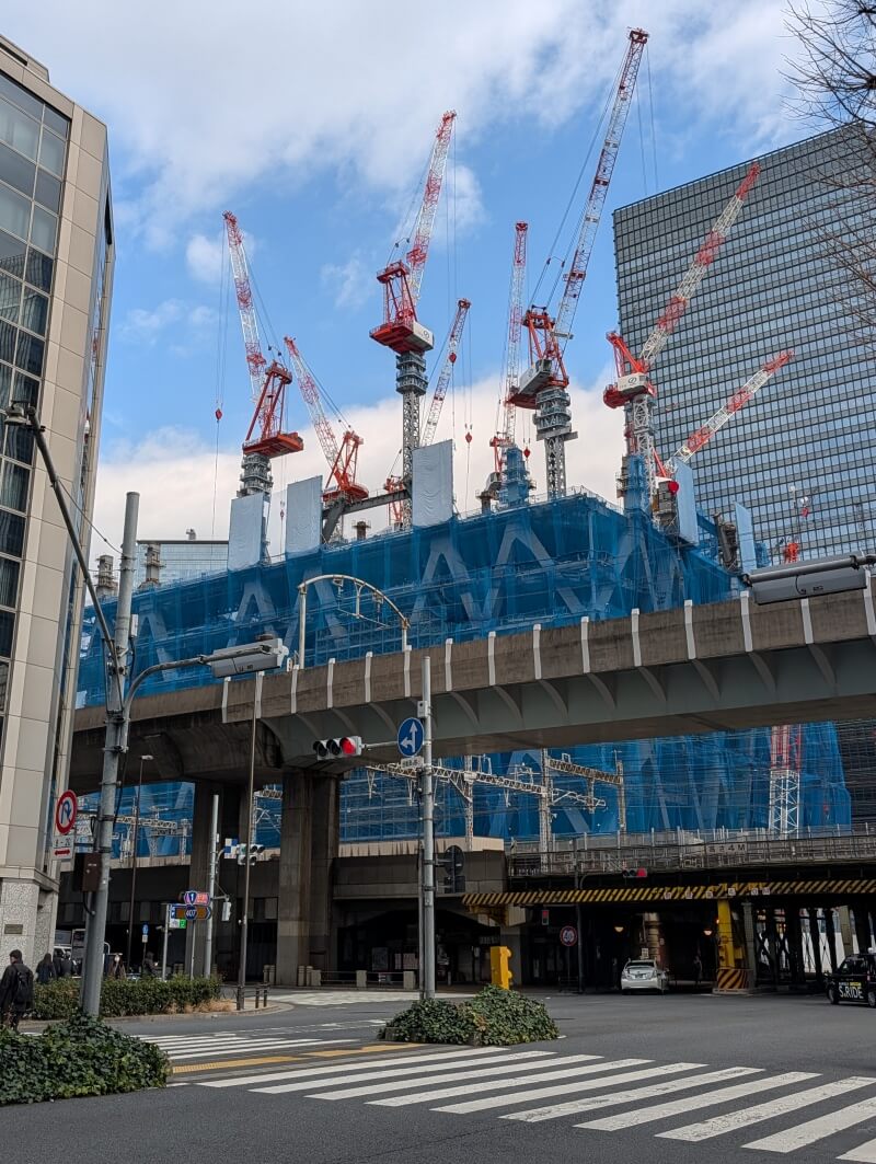 東京駅日本橋口側から、施工中の建物を見た様子です。