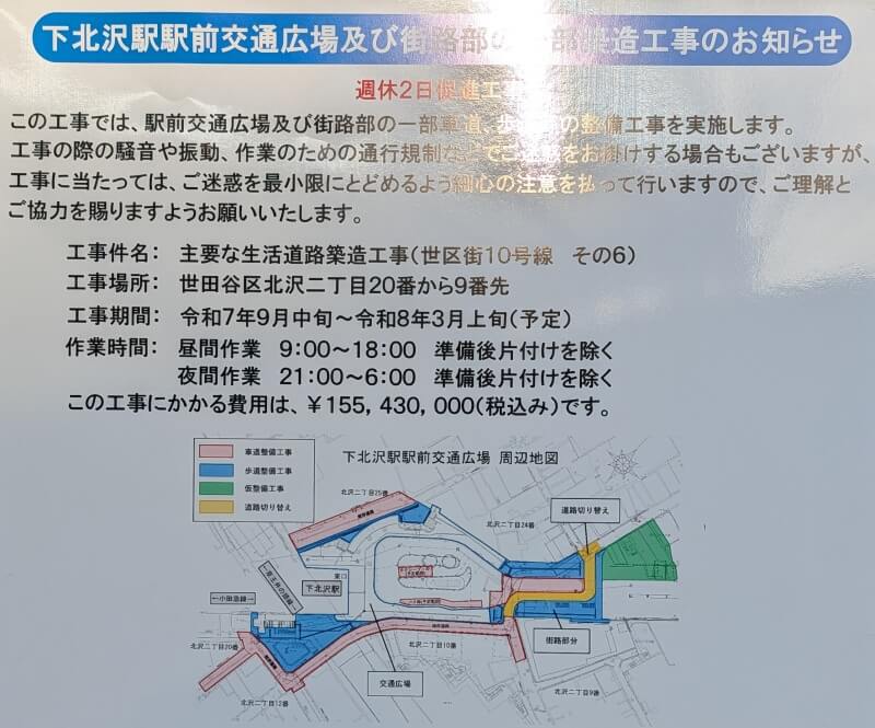 下北沢駅駅前広場整備の工事の案内です。工事は令和8年3月13日迄となっていました。