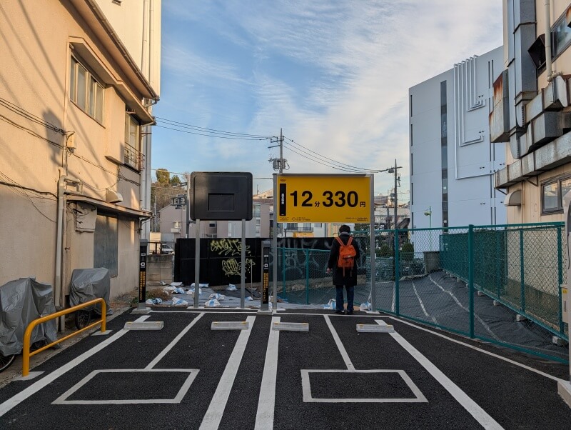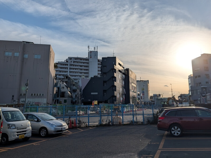下北沢駅駅から東北沢駅側に移動して、下北沢駅側を見た様子です。現在駐車場として利用されている空間が、道路となる予定です。