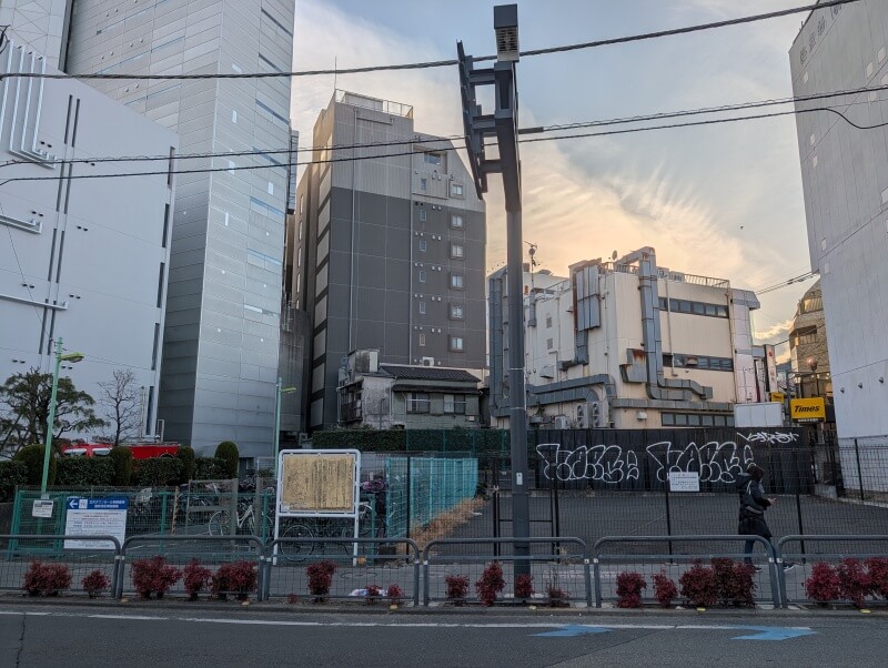 都市計画道路補助第54号線(下北沢1期)の道路予定地を、茶沢通り沿いに移動し、先ほどの駅前広場側を見た様子です。こちらは、道路予定地にまだ建物が残っていました。