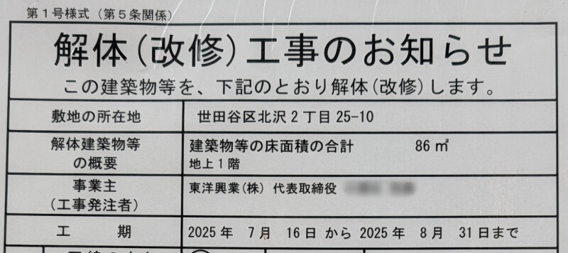 都市計画道路補助第54号線(下北沢1期)用の道路計画予定地付近から、解体工事中の建物を見た様子です。