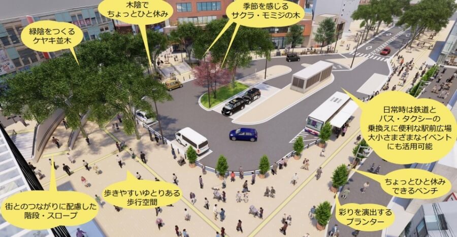 以下、世田谷区の資料より、下北沢駅駅前広場の完成イメージ図です。駅前広場完成後は、天狗祭りの会場がどうなるのか気になりました。大井町駅の例を出すと、お祭りの時は駅前広場の車道をお祭り会場として使っています。なので、下北沢駅駅前広場もお祭り会場として、再び利用されるのかもしれません。