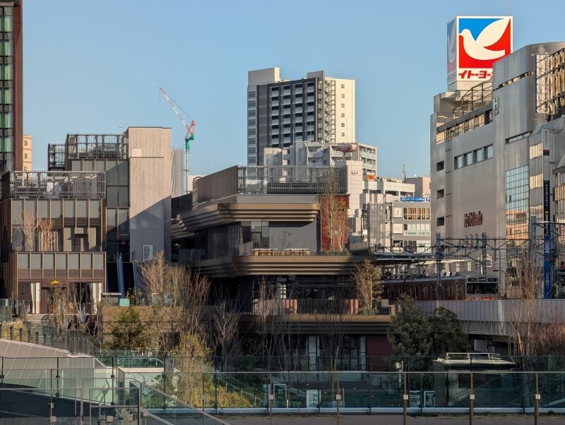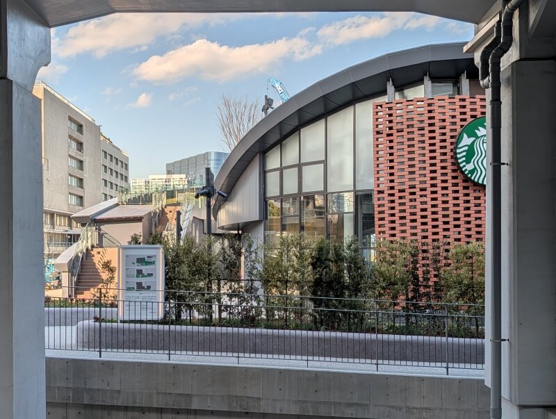 東急大井町線の高架の下から、「TRACKS PARK」内にオープンするスターバックスを見た様子です。