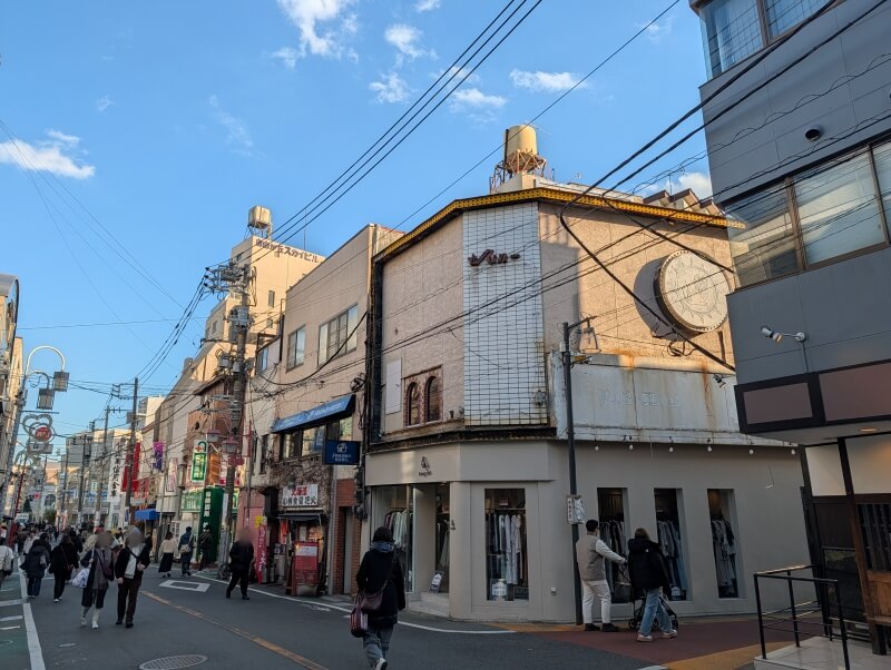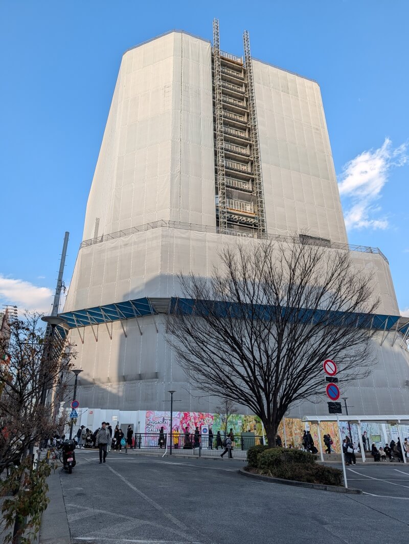 再開発の敷地の東側の女神通りと自由が丘デパートの間から、高層階を見上げた様子です。
