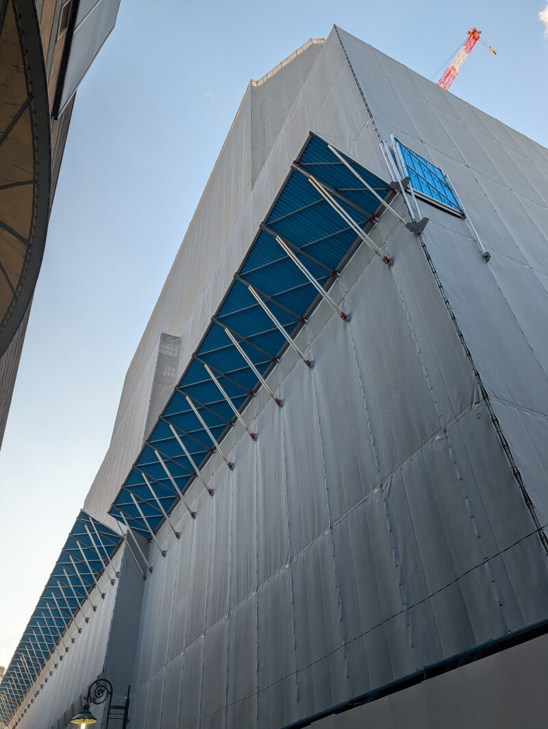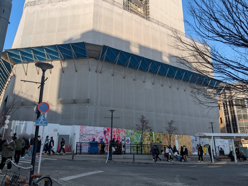 自由が丘駅正面口駅前広場の南側から、施工中の建物を見た様子です。