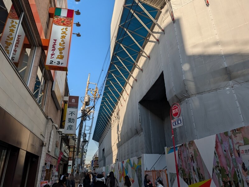 再開発の敷地北側の、すずかけ通り(都市計画道路補助第46号線)の西側から、再開発の敷地の低層階を見た様子です。