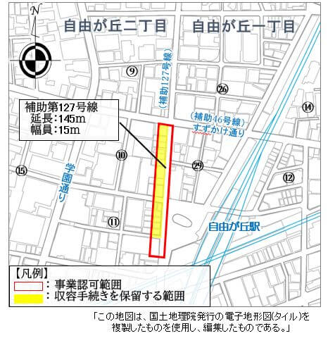 以下は、目黒区のページより、都市計画道路補助第127号線の事業位置図です。事業期間は、令和11年3月31日迄となっていました。
