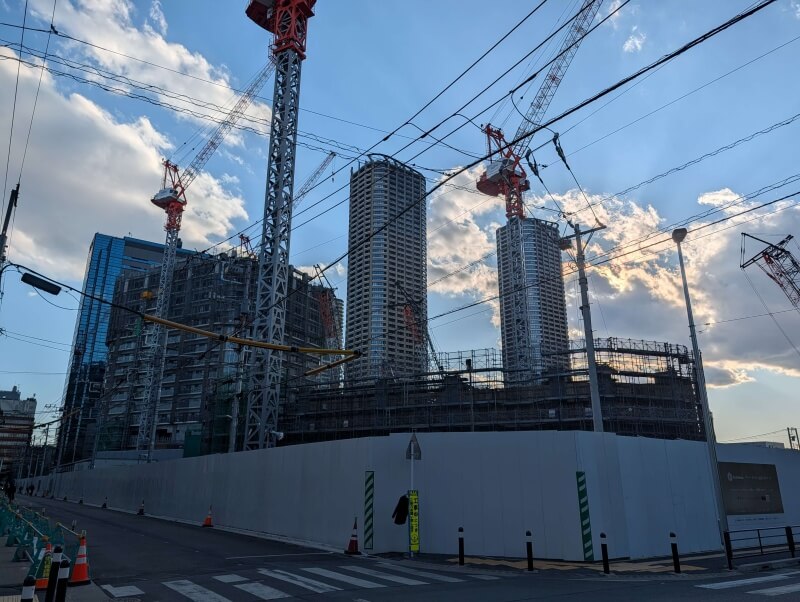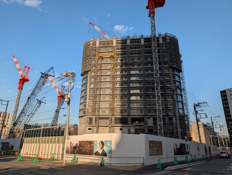 敷地南西側の、「パークシティ武蔵小杉ザ ガーデン タワーズイースト」付近から、施工中のサウス棟を見た様子です。