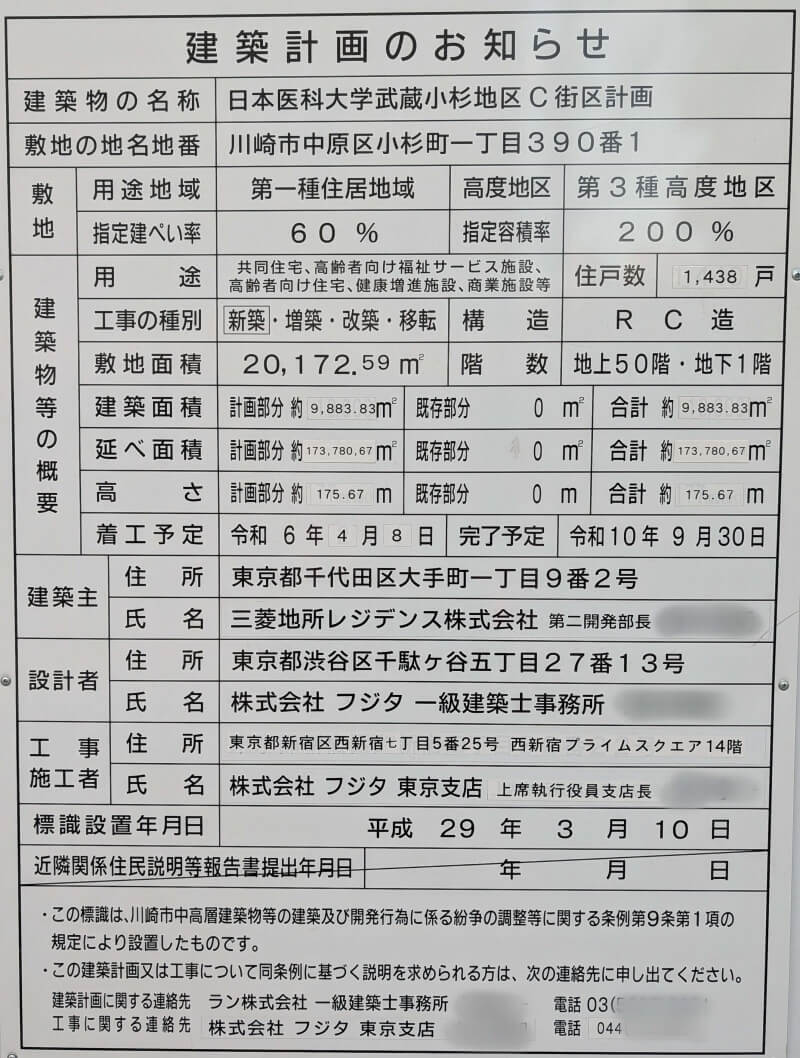 50階180m級「事業計画の構想の概要」が出てた、「学校法人日本医科大学武蔵小杉キャンパス再開発計画」の様子 2015年8月1日撮影