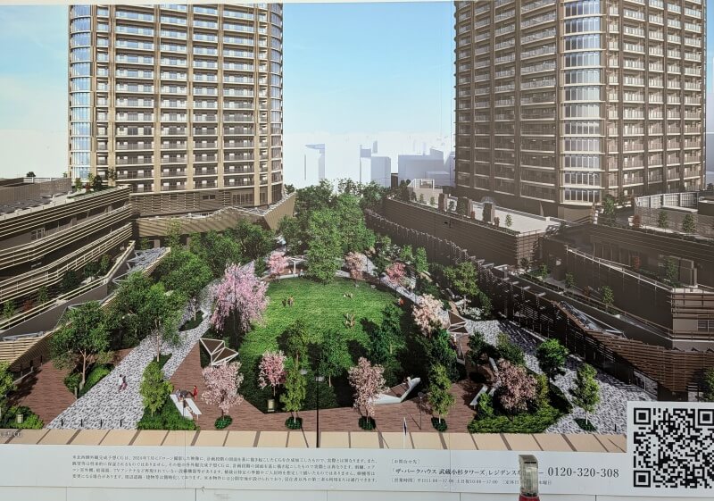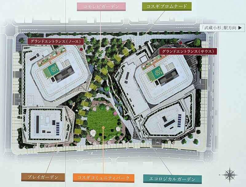 現地に掲示されていた、低層階のイメージ図です。低層階には、保育所やスーパー、そしてサウス棟とノース棟の間には、コスギコミュニティパークという広場が出来る予定です。