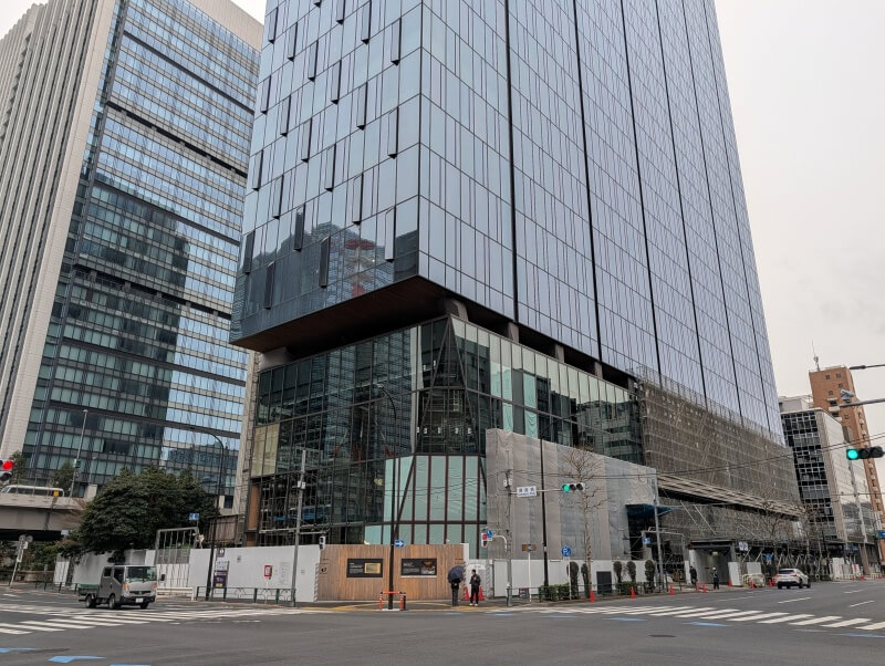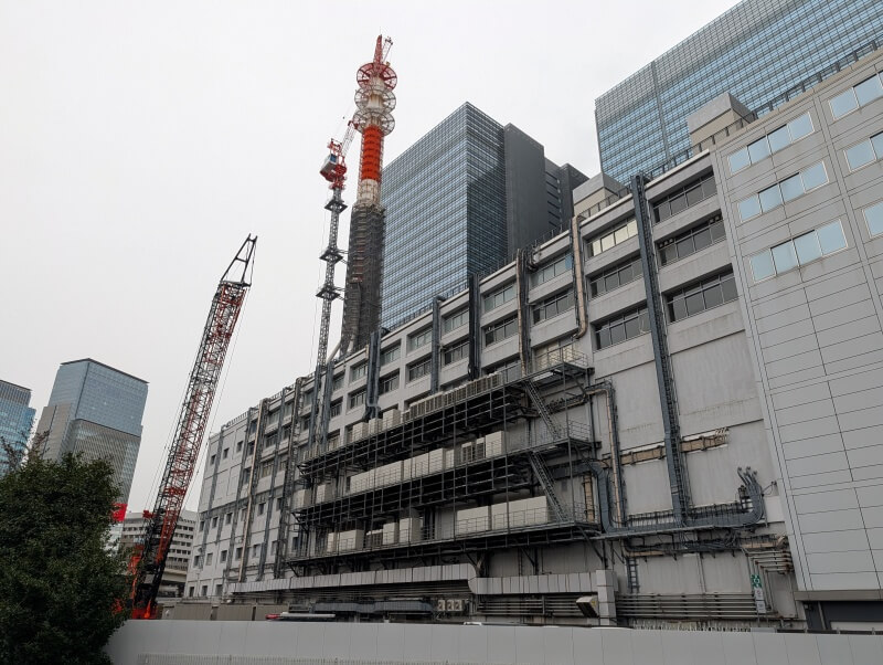 NTTコミュニケーションズ 大手町ビル本館のそばから、施工中の建物を見た様子です。