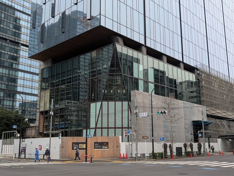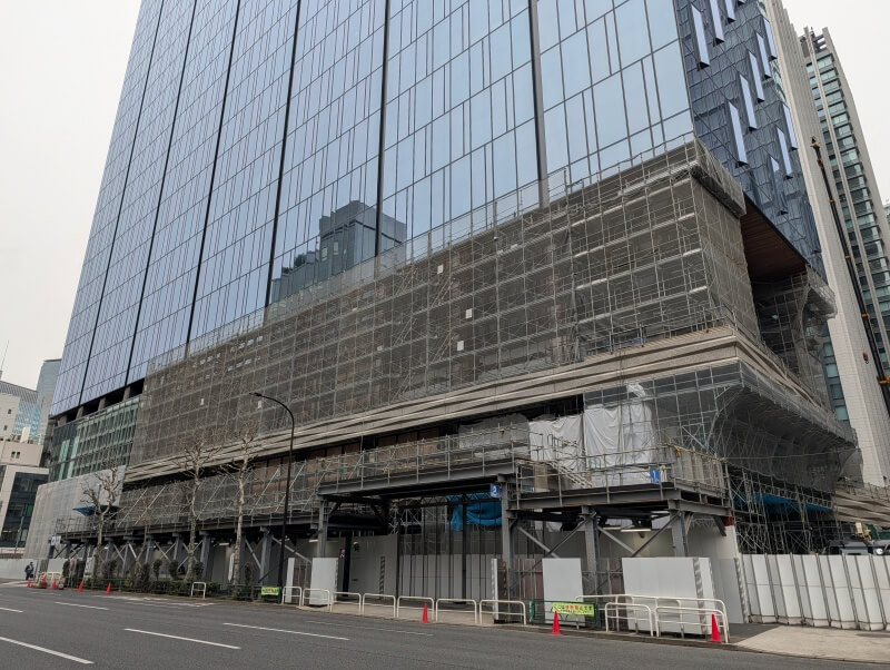 鎌倉橋交差点から、建物低層階を見た様子です。低層階のガラスカーテンウォールが段々と見えてきていました。