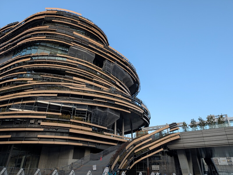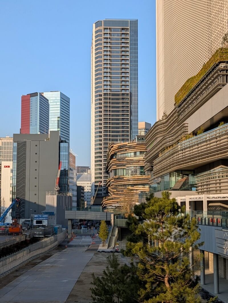 高輪ゲートウェイシティの文化創造棟の6階45m「MoN Takanawa: The Museum of Narratives」(モン タカナワ: ザ ミュージアム オブ ナラティブズ)と、44階172m「高輪ゲートウェイシティレジデンス」を撮影した様子です。