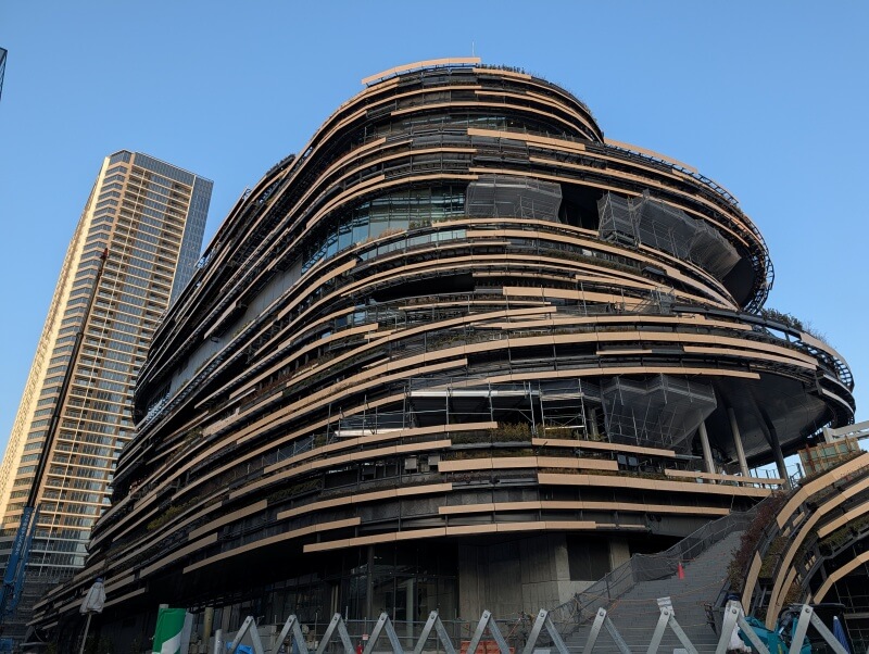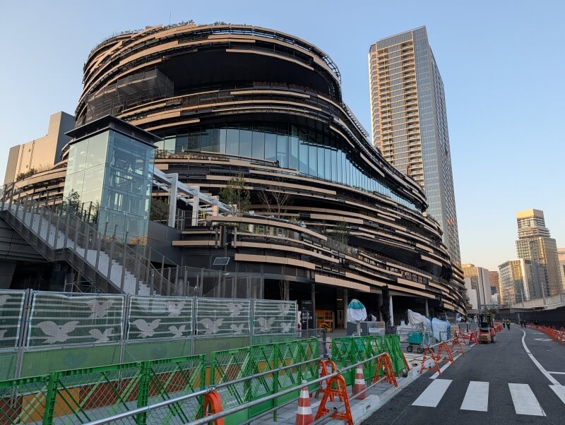 「モン タカナワ: ザ ミュージアム オブ ナラティブズ」と、44階172m「高輪ゲートウェイシティレジデンス」の様子 2025年11月30日撮影