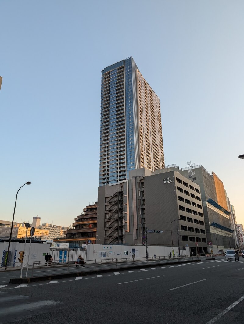 高輪大木戸跡付近から、高輪ゲートウェイシティレジデンスを見た様子です。