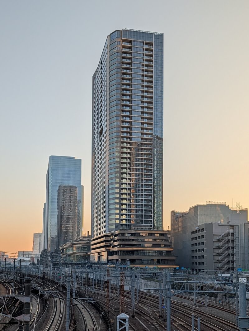 札の辻橋の上から、高輪ゲートウェイシティレジデンスを見た様子です。