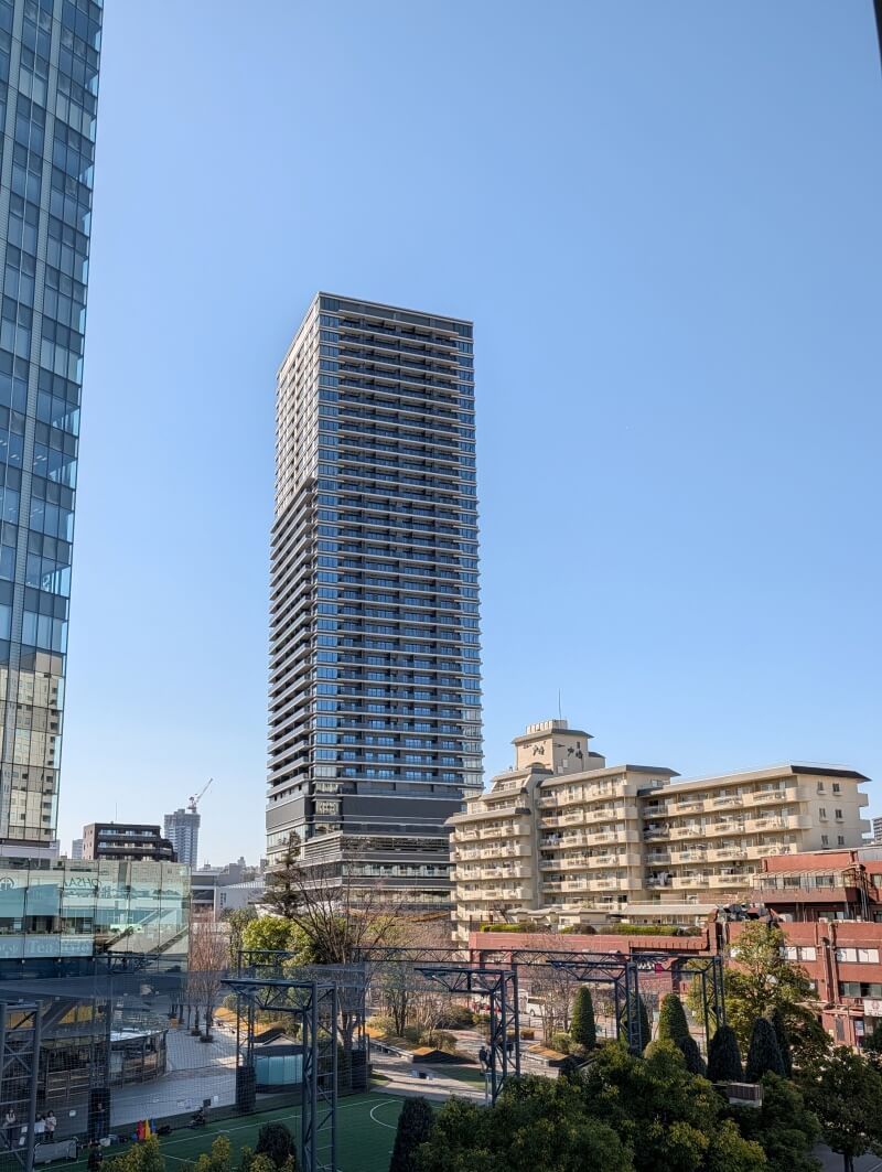 ThinkPark Tower2階から、大崎ステーションレジデンス南側を見た様子です。低層階の下の方の建物は、まだカバーで覆われていました。
