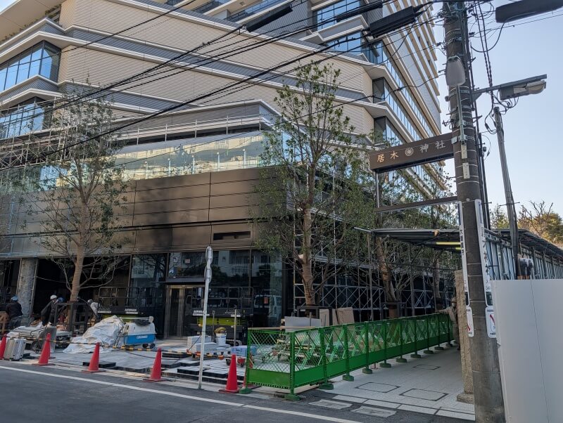 居木神社の参道入口付近を見た様子です。以前掲示されていた建築計画のお知らせに店舗と記載があったので、低層階には店舗が入りそうな作りとなっていました。