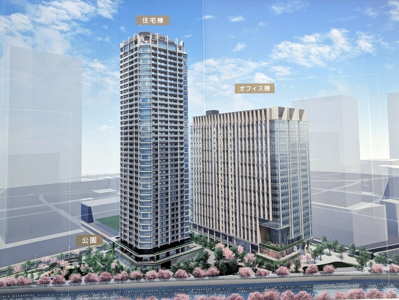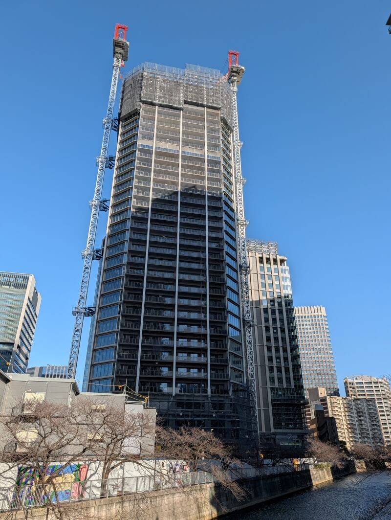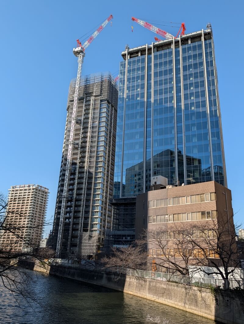 目黒川沿いの「イマジカ東京映像センター」跡地等を含むエリアで進められている再開発の、40階149m,20階100m「大崎リバーウォークガーデン」(東五反田二丁目第3地区第一種市街地再開発事業)の様子です。