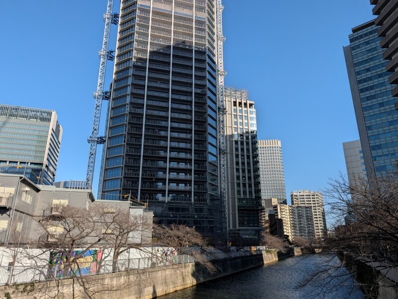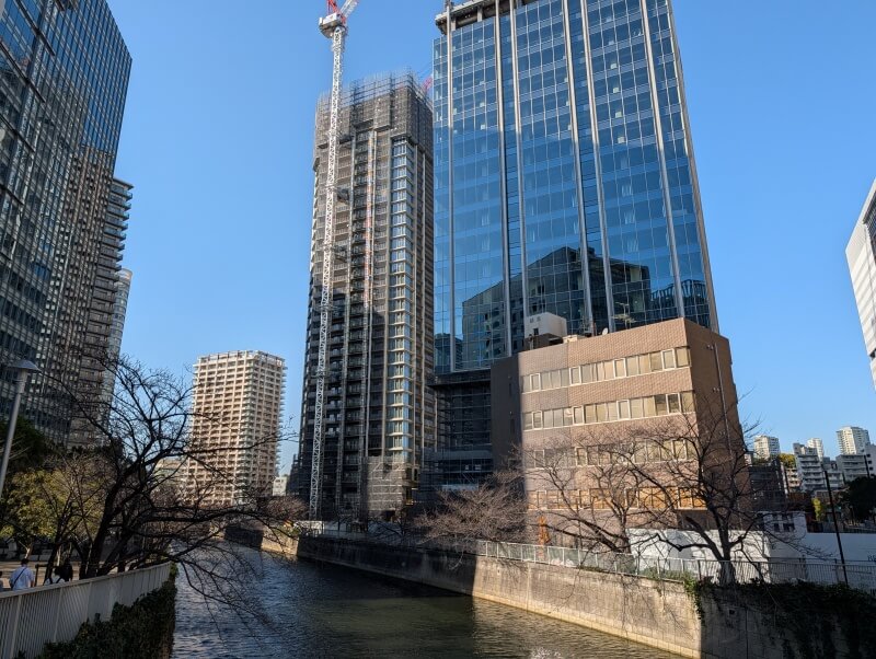 目黒川に架かる、御成橋から再開発の敷地を見た様子です。