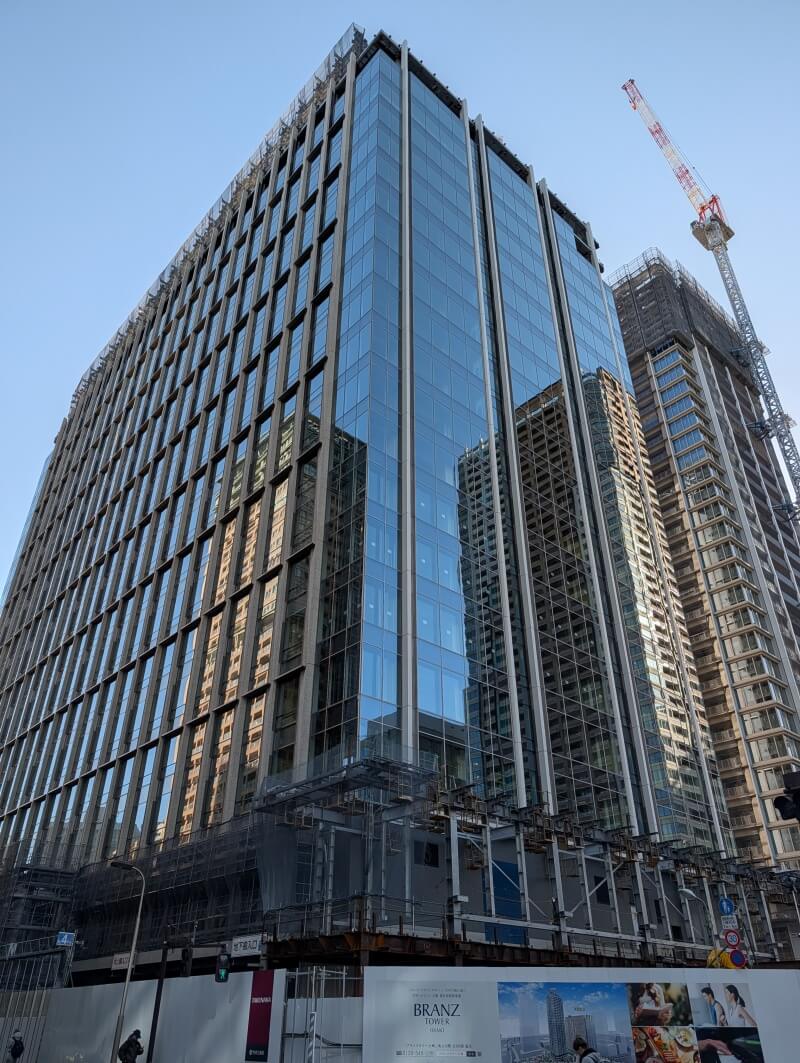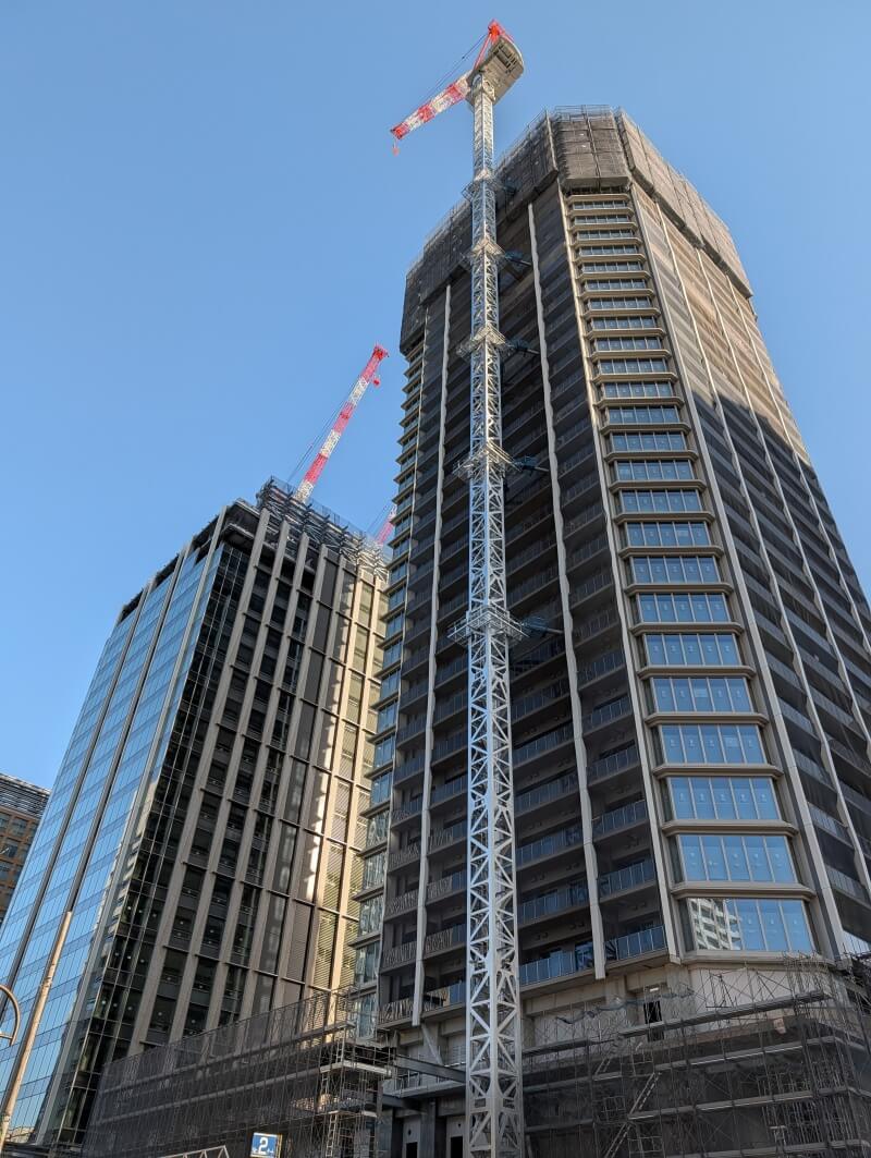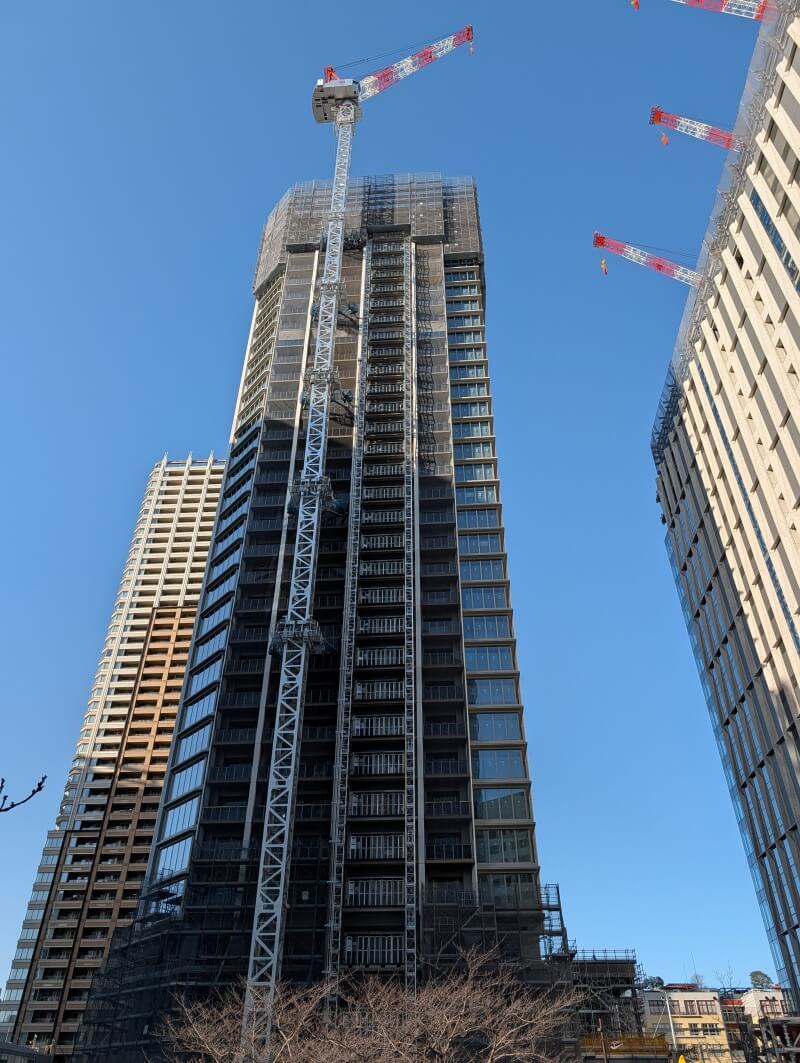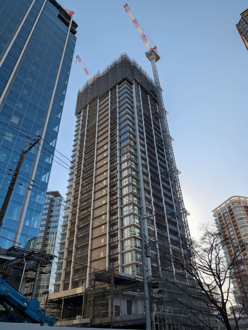業務棟はルーフトップ付近を施工中で、住宅棟の「ブランズタワー大崎」は34階付近を施工中でした。
