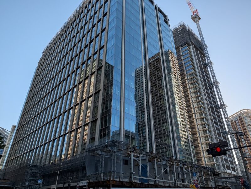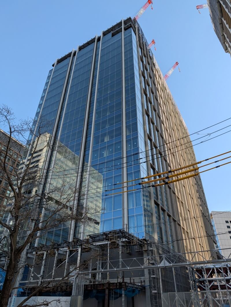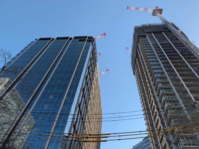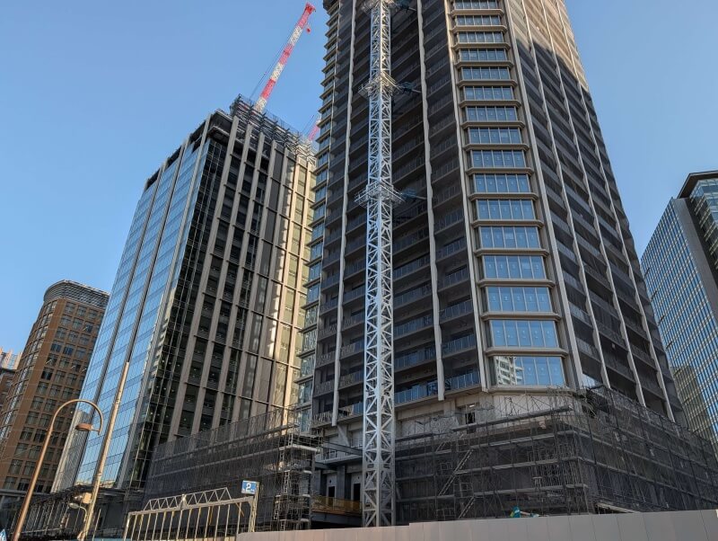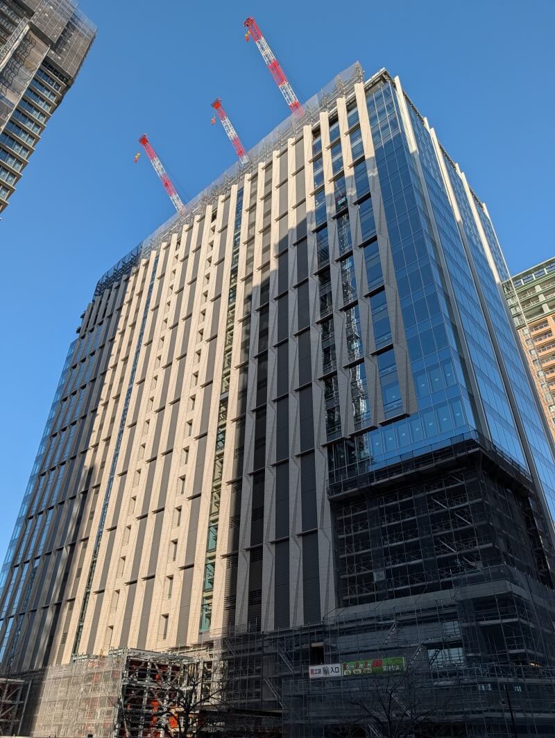 業務棟はルーフトップ付近を施工中で、住宅棟の「ブランズタワー大崎」は34階付近を施工中でした。